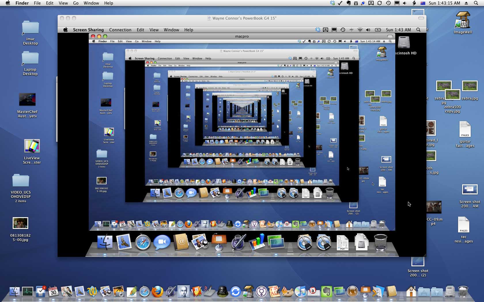 On the Macintosh you can ‘share a screen’ and look it it from another computer. I wondered what would happen if you then shared that screen back to the other computer so that they are both sharing with each other. This is is what happened – kind of standing in a lift with mirrors on both sides of you! (Click on the picture to enlarge it)